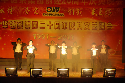 整場慶典晚會由18個文藝節(jié)目組成,其中16個節(jié)目由東華員工自編、自演,這些節(jié)目包括歌舞、小品、雜技、啞劇等等,節(jié)目集思想性、藝術性和觀賞性為一體。員工們以優(yōu)美的歌聲、輕盈的舞姿、蓬勃的激情,充分展示了東華創(chuàng)建20年來所發(fā)生的巨大變化和取得的輝煌業(yè)績,栩栩如生地體現(xiàn)了東華兒女團結奮進、求真務實、開拓創(chuàng)新的良好形象和精神風貌。宣碧華董事長的一首清唱《讀毛主席的書》,把整臺晚會推向了高潮,員工們掌聲不斷。