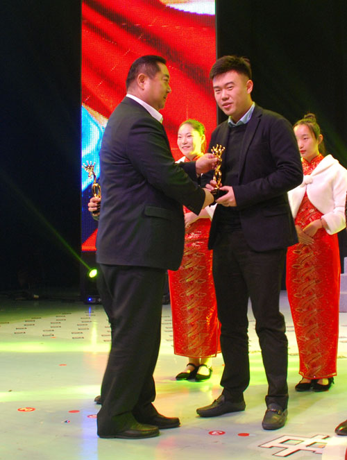 副董事長宣成(中)與其他十佳創(chuàng)業(yè)明星高興獎(jiǎng)杯