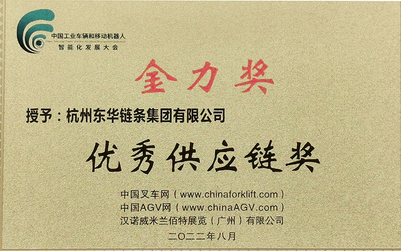 8月24日,由中國叉車網(wǎng)、中國AGV網(wǎng)、漢諾威米蘭佰特展覽(廣州)有限公司聯(lián)合主辦的“2022中國工業(yè)車輛和移動機器人智能化發(fā)展大會暨頒獎盛典”在廣州市中國進出口商品交易會展館舉行。東華被大會授予“金力獎-優(yōu)秀供應(yīng)鏈獎”,是獲獎的唯一一家鏈條企業(yè)。